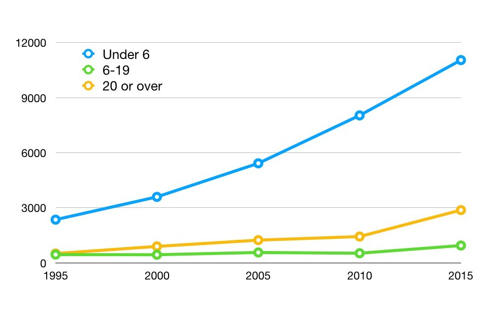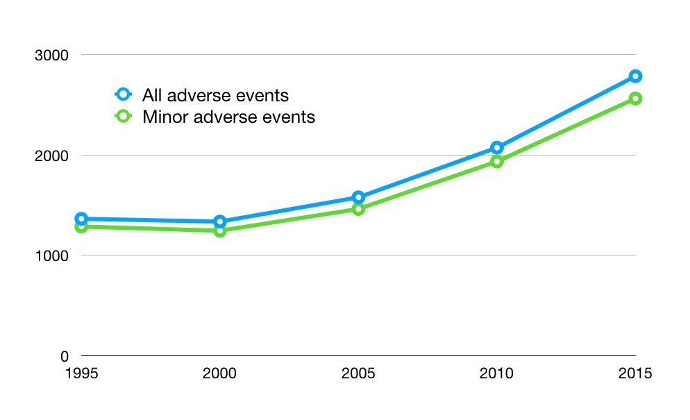 図1は、1995年から2015年にかけて米国の毒物センターに報告された、精油による有害事象の件数を示しています。これらの大半は深刻なものではなく、またほとんどが偶発的なものでしたが、6歳未満の幼児では、それより年長の子供や成人と比較して懸念すべき増加傾向が見られます。これは、年間数億ドル規模に成長したアロマセラピー産業の拡大に伴い、幼い子供たちがその「犠牲者」となりつつあることを示唆しているのです。